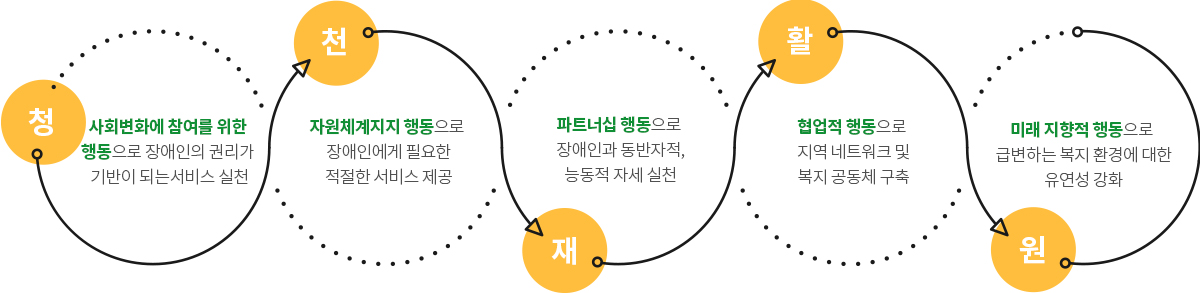사회적 책임을 다하기 위해 우리는 장애인의 권리를 기반으로 하는 감성 복지를 지향하고자 합니다. 지역사회 속에서 장애인을 위한 따뜻한 만남이 있고 행복한 향기가 있는 건강한 사회를 만들고자 생각하는 복지를 넘어 따뜻한 행동으로 장애인 복지 실현을 위해 실천하는 시설이 우리의 미션입니다.